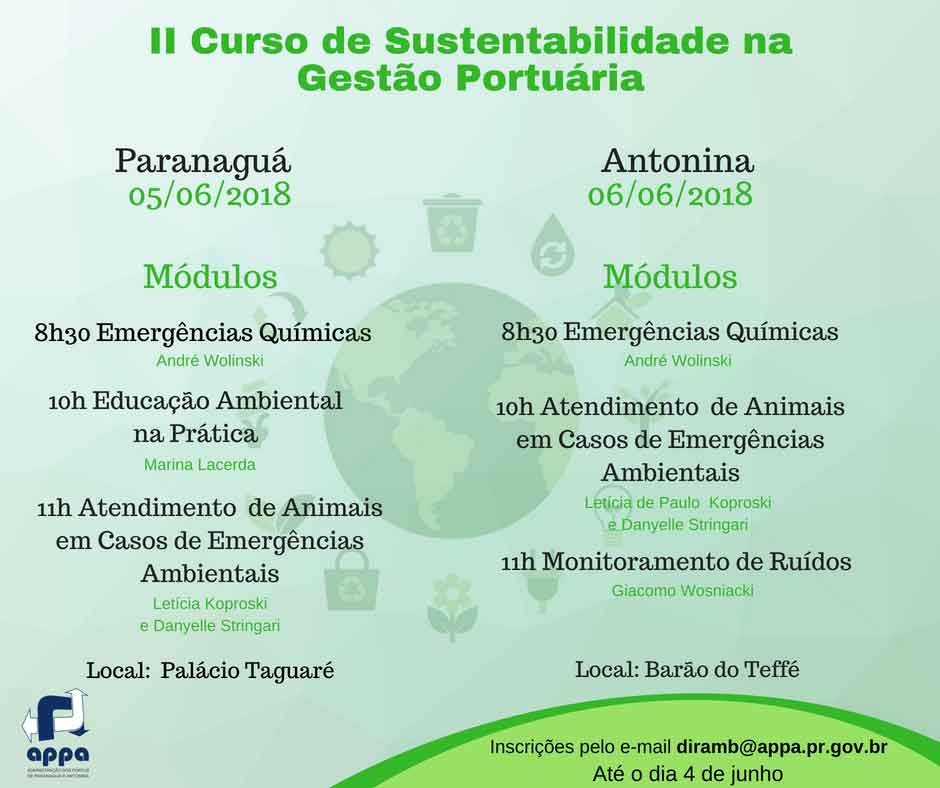 Administração dos Portos de Paranaguá e Antonina (Appa) promove, na Semana do Meio Ambiente, a segunda edição do curso Sustentabilidade na Gestão Portuária. Em Paranaguá, o evento ocorrerá no dia 5 de junho e em Antonina no dia 6 de junho. Todos os participantes receberão certificados.