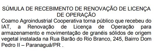 SÚMULA DE RECEBIMENTO DE RENOVAÇÃO DE LICENÇA DE OPERAÇÃO